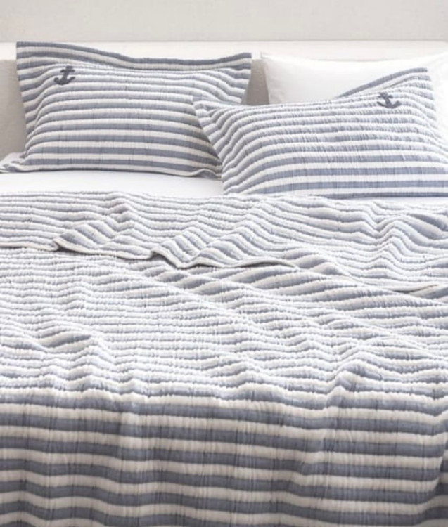 این روتختی با طراحی راهراه ظریف در طیف رنگی سفید و طوسی روشن، الهامگرفته از سبک دکوراسیون ساحلی و مینیمال است و فضایی آرام، خنک و منظم به اتاق خواب میبخشد. جزئیات ظریف مانند نماد لنگر روی روبالشیها، حس لطیف سبک دریایی را به زیبایی کامل میکند.